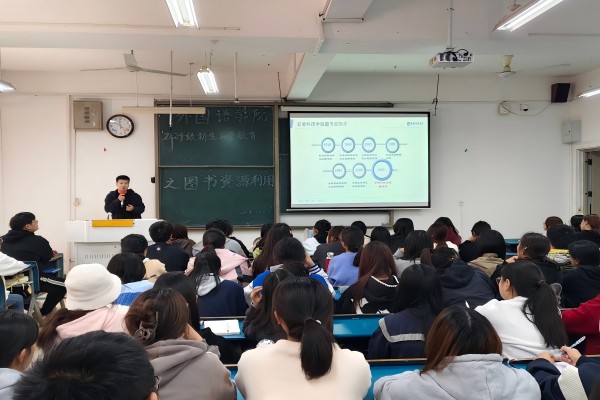 为提高新生利用图书资源的能力,11月6日下午,外国语学院在新知楼A座110教室举行图书资源利用讲座。讲座由学校图书馆蒋亚博老师主讲,外国语学院团委副书记宋兵兵和全体2024级新生共同聆听讲座。