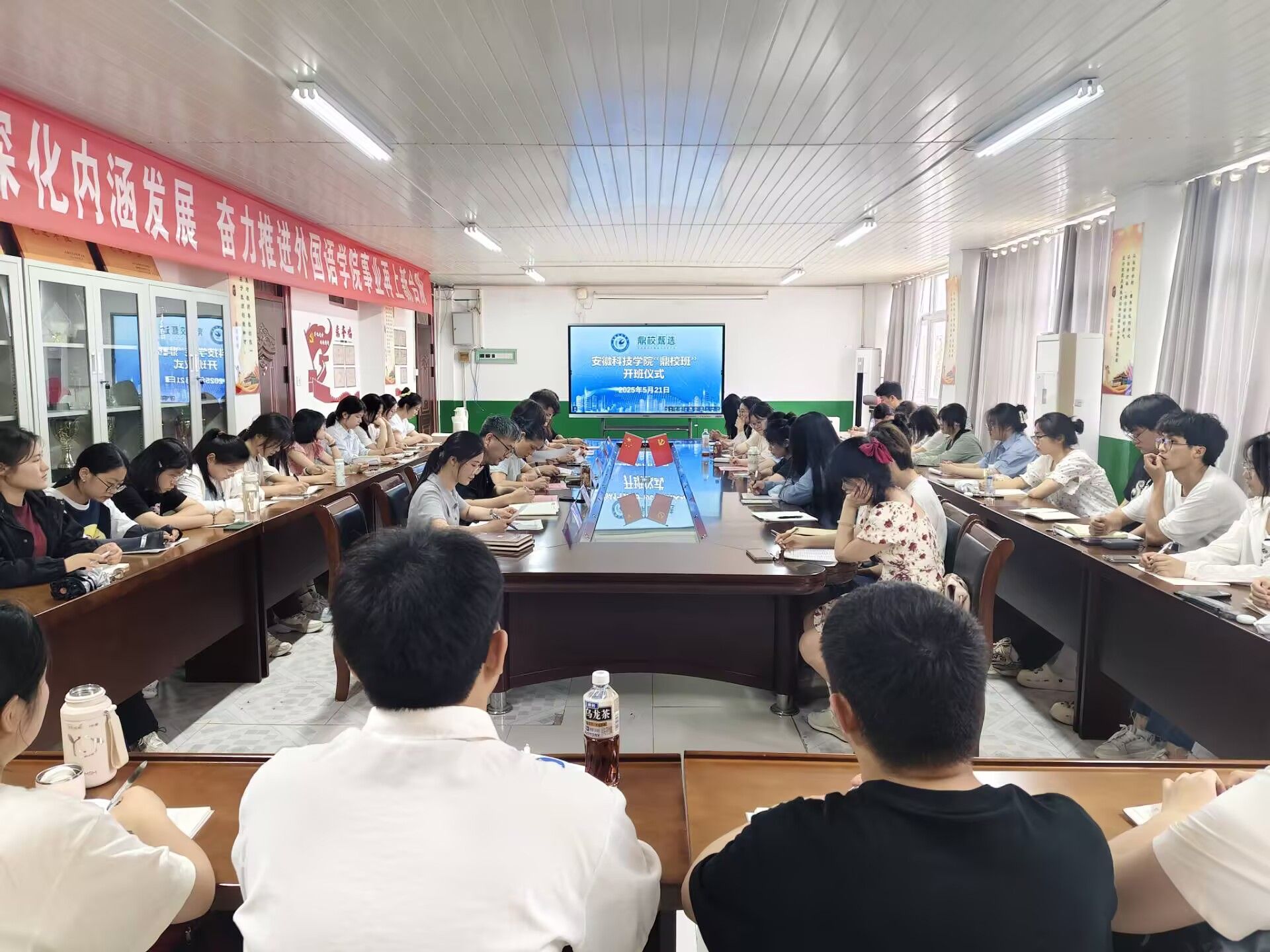 5月21日下午,WG官方网站“鼎校班”开班仪式在学院会议室举行。外国语学院党政领导、安徽鼎校教育科技有限公司(以下简称“鼎校教育”)相关负责人以及“鼎校班”40名学员参与活动。开班仪式由学院党委副书记张海亮主持。