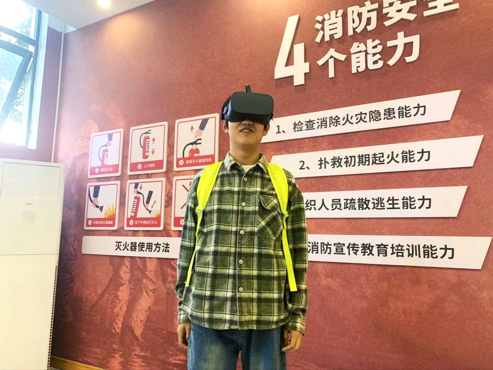 活动现场,同学们共同学习了消防安全基础知识及现场演示的灭火器、消防栓等常见消防器材的正确使用方法,随后学生们佩戴VR设备,进入虚拟火场环境。体验内容涵盖消防隐患排查、高层火灾逃生、校园火灾逃生等多个模拟场景。通过视觉、听觉与操作的深度融合,体验者可以身临其境感受火灾现场的紧张刺激氛围, 实现“情景交融+自主应对”的实训模式。逼真的险情和互动操作,使同学们在沉浸体验中掌握了应急疏散、自救互救等关键技能。
