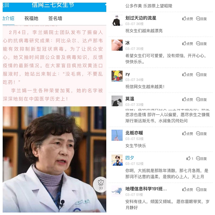 疫情期间,许许多多人奋战在疫情防控一线,这些人中不乏女性的身影,她们奉献自我,用自己的能量点亮一片片星空,温暖人心。期间,信网学子门也踊跃担当起家乡战“疫”的志愿者,积极参加志愿者服务工作。用汗水和努力守护家园。她们的身影出现在街头、村口的执勤点,对进出人员进行体温测量、安全排查、信息登记、行程劝返、宣传疫情防控知识等,她们用细心、爱心、信心为最终打赢疫情防控战贡献自己的一份力量。她们只是众多巾帼英雄的缩影,在疫情一线,有更多的“她”在奋斗,学院组织学生在易班平台线上为她们致敬,“云”上为她们祝福!