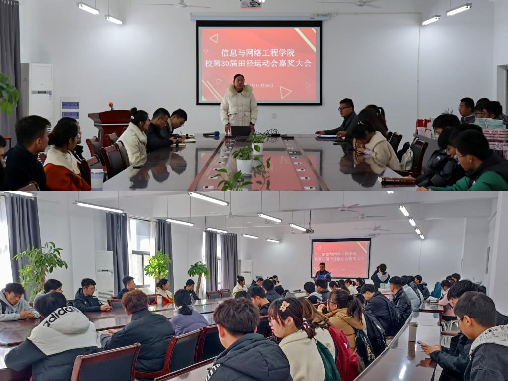 11月24日中午,信息与网络工程学院在尚行楼B418召开了校第三十届田径运动会表彰大会。学院党委副书记韦乃学,专职辅导员陈凯、李军成、丁阿敏、崔北坤出席了本次大会,运动员代表和学生干部代表参加本次大会,大会由崔北坤主持。