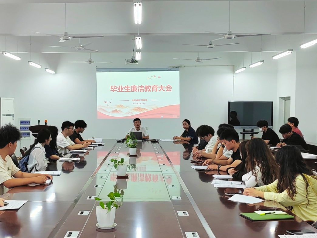 5月30日上午,信息与网络工程学院在尚行楼B418会议室开展毕业生廉洁教育大会,会议由党政办副主任陈凯主持,2025届在校毕业生参加了本次会议。