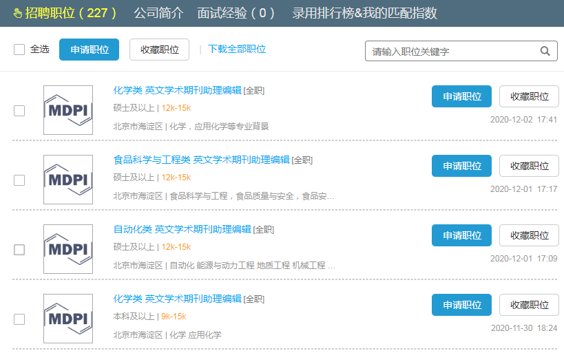 瑞士MDPI出版公司(Multidisciplinary Digital Publishing Institute)成立于1996年,是全球领先的Open Access出版公司之一,总部位于瑞士巴塞尔,同时在中国,西班牙,塞尔维亚设有分公司。 MDPI AG目前出版英文科技期刊180余种,其中SCIE期刊37个。期刊领域覆盖生物、化学、医药、机械、能源、环境等各学科,其中包含众多国际知名期刊如Molecules, Sensors, IJMS, Marine Drugs, Energies, IJERPH等。期刊编委会由24400多位国际著名学者组成,包括多位诺贝尔奖获得者,目前已有384100多位来自世界不同国家的作者在MDPI期刊上发表过文章,文章总数超过12万篇。更多信息请访问MDPI主页:www.mdpi.cn。 MDPI北京代表处于2008年成立,注册名称为陡埠(北京)科技服务有限公司,主要负责MDPI期刊的编辑出版工作,现有正式员工390余人,其中硕博300余人。MDPI武汉代表处于2013年4月成立,注册名称为陡埠(武汉)科技服务有限公司,现有正式员工480余人,其中硕博260余人。2017年4月起,公司正式更名为曼迪匹艾(北京)科技服务有限公司和曼迪匹艾 (武汉)科技服务有限公司。