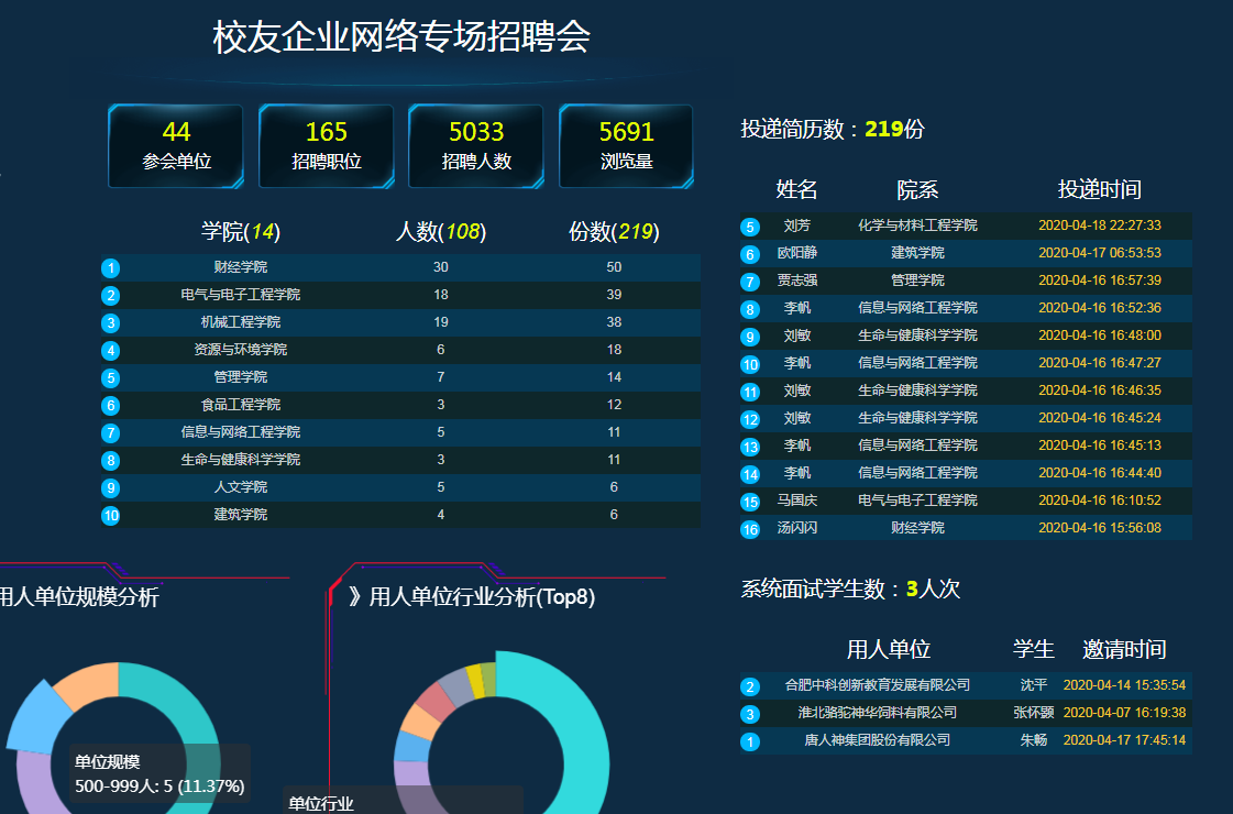 本次校友企业专场招聘会使企业和学生足不出户,实现线上简历投递、远程面试和签约,一定程度上减轻了疫情对毕业生就业工作的影响,加强了校友及校企合作企业与学校的交流合作,受到企业和毕业生的认可和好评,并将进一步助力2020届毕业生成功就业!