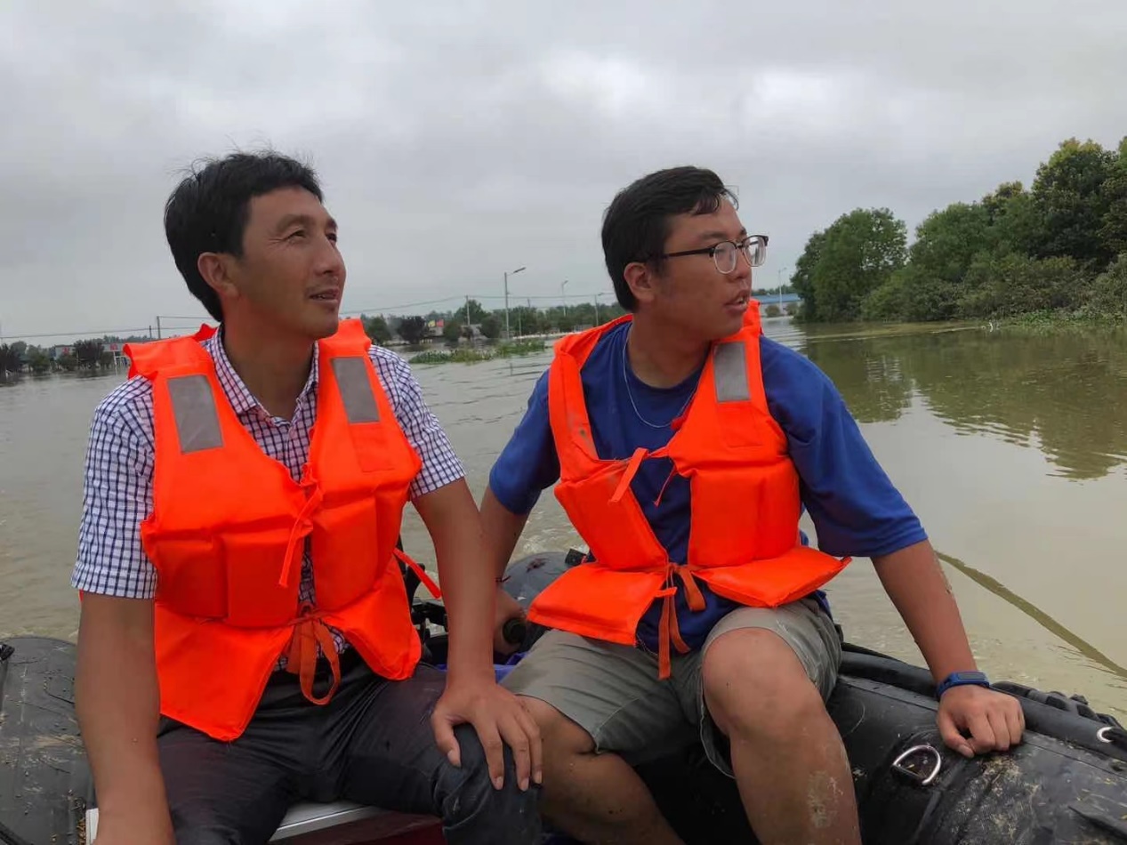 愿者们达到现场后,顾不上休息,立刻投入到鹅厂重建工作中。他们帮助清退洪水,转移鹅苗孵化设备、清理屠宰车间废墟,洗刷清扫鹅舍卫生,寻找并清点剩余鹅苗数量,配备鹅苗饲料,做好鹅厂灾后卫生防疫工作。特别是2019级畜牧领域研究生徐茂森,洪水之前就一直在基地参观学习,帮助鹅厂养殖鹅苗。发生灾情之后他更是不顾危险,奋战在抗灾一线。镇上断水断电断网,条件非常艰苦。徐茂森不仅帮助消防员把镇上老人和小孩转移到安全地方,协助政府人员发放救灾物资,同时在人员安排妥善后,又随基地工作人员一起划船几公里寻找被大水冲走的皖西白鹅,以及被大水冲走的场内物品。