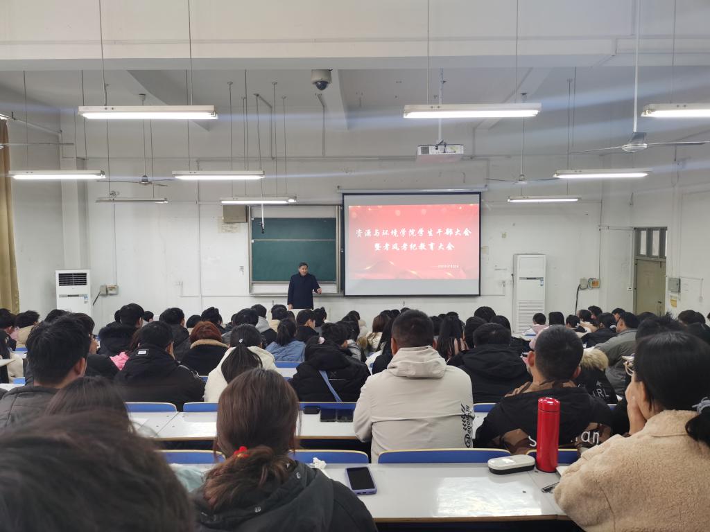 为总结本学期学生工作,浓厚学习氛围,促进考风考纪建设,12月22日中午,资源与环境学院于求知楼A106召开学生干部大会暨考风考纪教育大会。党总支书记李孟良,党总支副书记沈树周,副处级辅导员谢宜勤,党总支秘书兼团委书记吴国良,专职辅导员杨小晗、王丽萍出席本次会议,学生会全体成员和非毕业班主要班委参加。会议由谢宜勤主持。