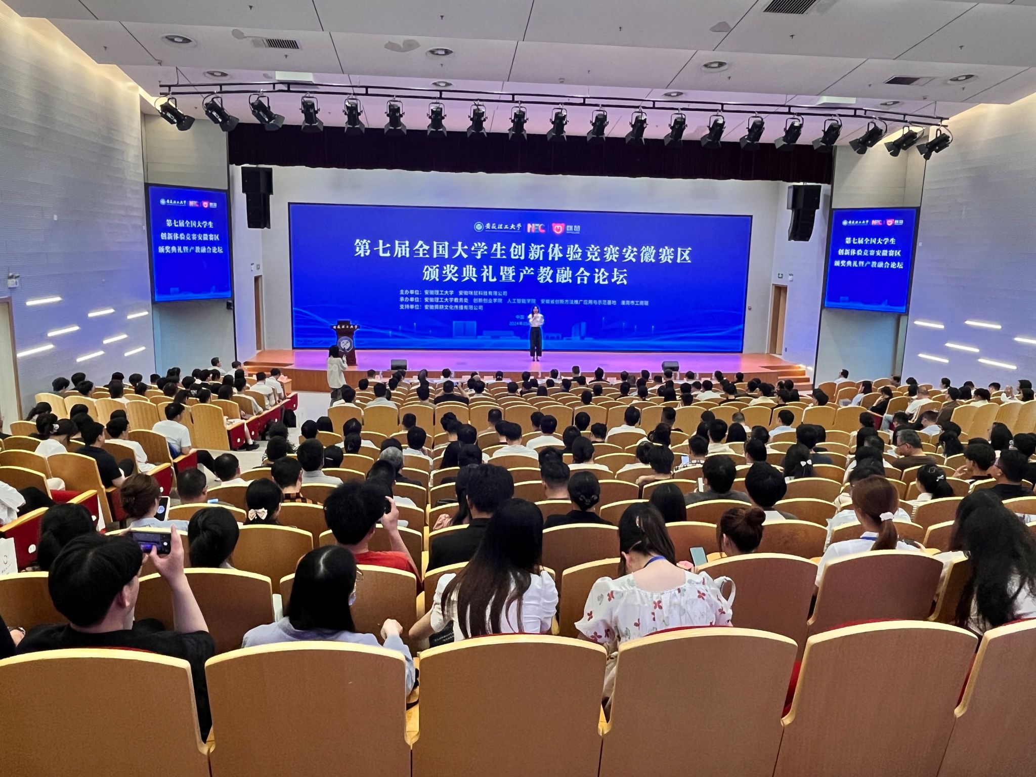 5月10日下午,第七届全国大学生创新体验竞赛安徽赛区颁奖典礼暨产教融合论坛在安徽理工大学举行。安徽省教育厅高教处副处长朱永国、安徽理工大学副校长宫能平、淮南市工商联主席杜本硕、中国创造学会副理事长冷护基、合肥工业大学本科生院院长黄云志、安徽大学教务处处长李学俊、安徽理工大学教务处处长王成军、南京信息工程大学教务处副处长马巍等多所高校的领导参加了产教融合论坛。