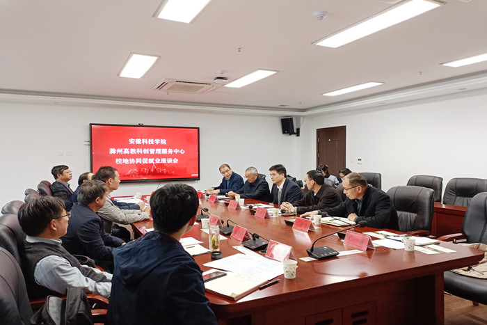 11月18日下午,学校与滁州高教科创城、南谯区校地协同促就业座谈会在龙湖校区举行。南谯区委副书记、滁州高教科创管理服务中心副主任施培智,南谯区委常委、组织部部长李国金,工大开元环保科技(安徽)股份有限公司、安徽恒创智能装备有限公司、安徽健驰智能科技有限公司负责人参加座谈。校党委委员、纪委书记、监察专员王强出席座谈会并讲话。座谈会由招生与就业工作处副处长何晓冬主持。